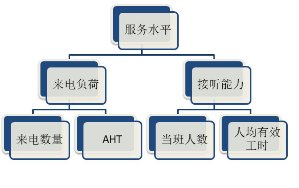 如上图所示,服务水平指标本身是来电负荷与接听能力平衡的结果。当来电负荷大于接听能力时,服务水平指标会下降;而当来电接听能力逐渐匹配或超过来电负荷时,服务水平指标就会上升(注:实际应用中,应考虑在一定的来电负荷下,所设定的不同服务水平指标对来电接听能力的不同需求)。因此,当服务水平指标下降时,我们第一个想到的可能原因就是来电负荷上升了。而来电负荷是由来电数量和AHT构成的,因此对这一原因的确认或排除就应该从这两个要素的分析着手。如果来电量与预测业务量相比较没有明显异常同时AHT也相对稳定的话,则可以排除来电负荷意外波动的原因,而把目光转向接听能力。